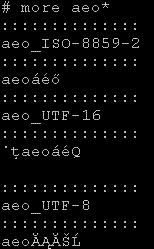 A példában szereplő "hd" (hexa dump) program egyéb Unixból lett Linuxba befordítva. A pand(or)a-n a "/h/public/c/csa/hd" fájlban megtalálható. (De 2008 októberben nincs is rá szükség, pillanatnyilag tartalmaz hd parancsot a Linux installáció.) Látható, hogy az ISO-8859-2 egy jellel kódolja az áéő betűket is, az UTF-8 az angol ABC betűit ugyanígy, az áéő betűket viszont 2-2 jellel. Az UTF-16 mindent (még a sorvége jelet is) két jellel, a szöveg két kezdőjele jelzi, hogy UTF-16 kódolású a szöveg. Az ő betű az egyes kódolásokban: