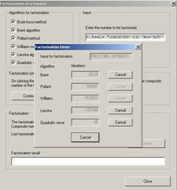 A CrypTool által megadott eredmények az alábbi két ablakban láthatóak, az első esetben látható, hogy a Pollard és Williams faktorizációs módszerek nem vezettek sikerre (nem aktívak a Cancel ablakok), a többiek esetében még a sokadik iteráció után sem kaptunk eredményt. A második ablakban a Brent faktorizációs módszer vezettet eredményre, 0.172 másodperc után.