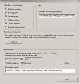 A kriptoanalízishez kapcsolódó másik példa, mely jól szemléltethető CrypTool-ban, az egész számok faktorizációjához kapcsolódik, ([1]). Az alábbi példa azt szemlélteti, hogy egy 200 jegyű összetett számot (ahol az összetett szám két prímszám szorzata) abban az esetben, mikor a két prím azonos nagyságrendű, azaz 100 bites szám, nem sikerül a programmal faktorizálni, de abban az esetben mikor a két prím eltérő nagyságrendű, azaz az egyik csak 20 bites, a másik pedig 180 bites szám, sikeres lesz a faktorizálás.